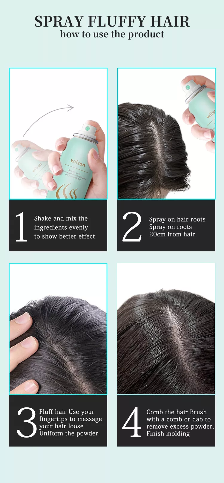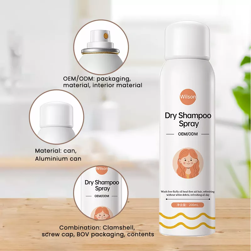 Wilson Instant sprej za hladen suhi šampon brez pranja z dodajanjem glicerina, trigliceridov, vitamina E, vitamina B5 in drugih sestavin za nego las, tako da lasje nahranijo in navlažijo, zapolnijo prhljaj in lase samim pomanjkanjem sestavin, medtem ko dopolnijo plast lasnega olja, popravijo poškodbe las, zaščitijo glavo pred zunanjim okoljem in končno dosežejo namen obnovitve zdravih las.