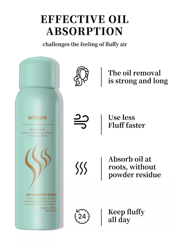 Wilson Instant sprej s hladnim suhim šamponom brez pranja je rešil veliko mastnih las. Glava začasno izgine, ne more umiti težave z lasmi, glavna surovina je rižev škrob, škrob ima porozno strukturo, adsorpcijsko sposobnost, je običajna higroskopna adsorpcijska surovina, lahko učinkovito absorbira odvečno maščobo na lasišču in očisti umazanijo las, razpršite in dodajte nekaj površinsko aktivnih in elektrostatičnih komponent za lažje odstranjevanje izdelkov iz las. Po uporabi se počutite sveže in naravno.